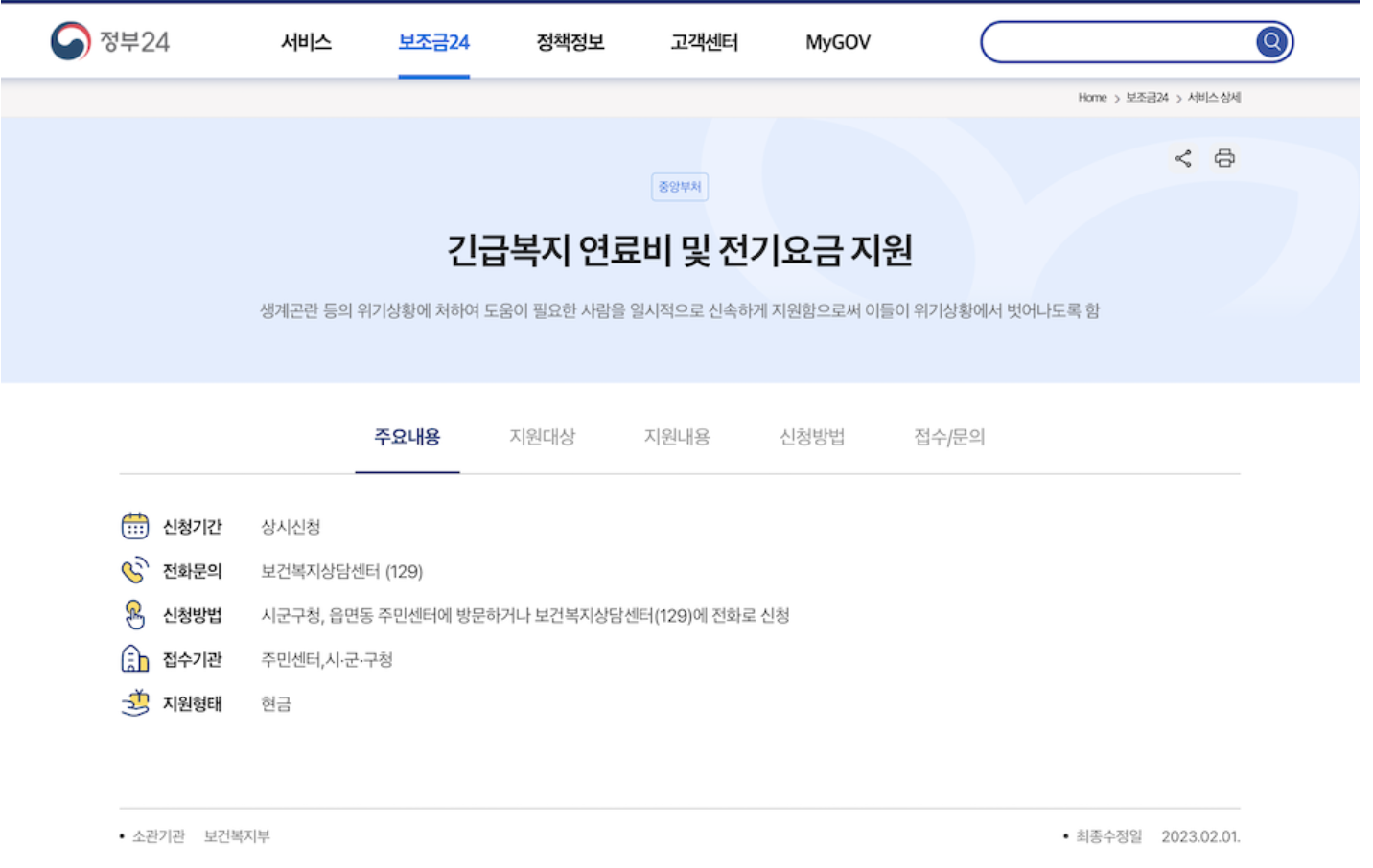 * 위기가정 대상이 되면 거주지에서 가까운 행정복지센터에 직접 방문하여 맞춤 안내 조회 및 신청을 도와드리고있다.