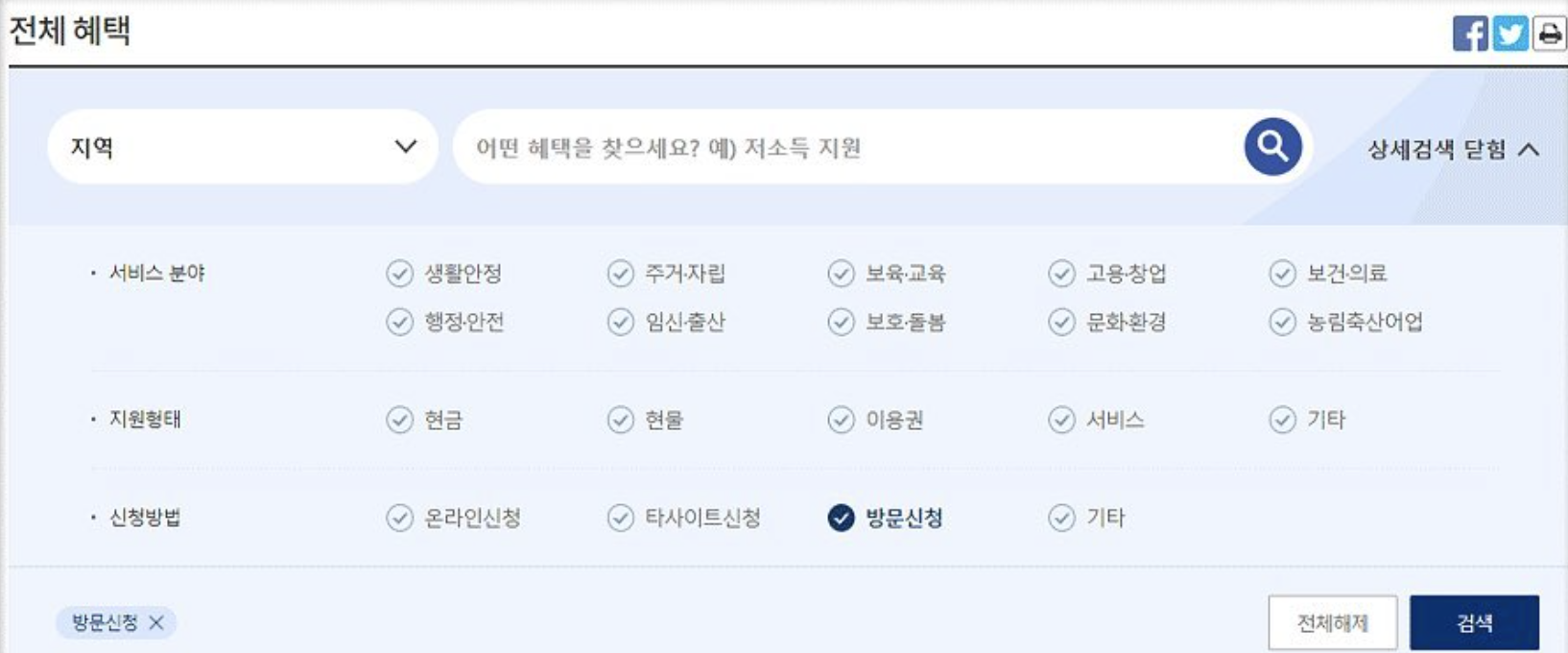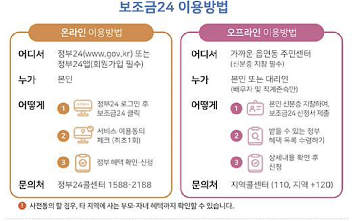 - 본인신분증 지참하여 보조금24 신청서 제출 > 받을수 있는 정부 혜택 목록 수령 > 상세내용 확인 후 신청