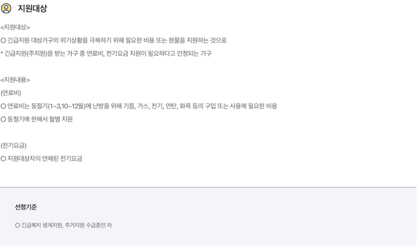지원 대상은 위기상황을 극복하기 위해 필요한 비용 또는 현물을 지원하는 것으로 긴급지원을 받는 가구 중 연료비, 전기요금 도움이 필요하다고 인정되는 가구다. 기름, 전기, 연탄, 화목 등의 구입 또는 사용에 필요한 비용을 동절기에만 월별 지원한다.