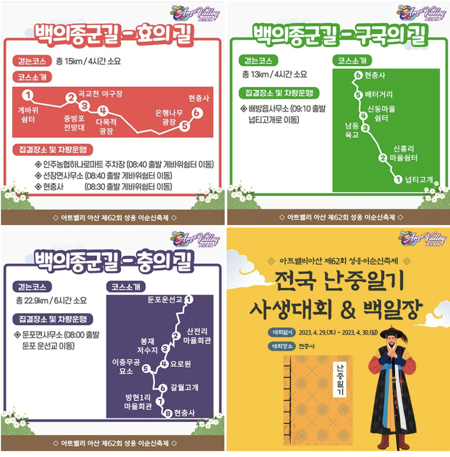 현충사 일원에서는 특히 백의종군길을 콘셉트로 걷기 대회, 마라톤대회를 운영합니다. 또한 사생대회, 백일장 등 다양한 행사를 진행하니 가족이 함께 참여하면 좋을 것 같습니다.