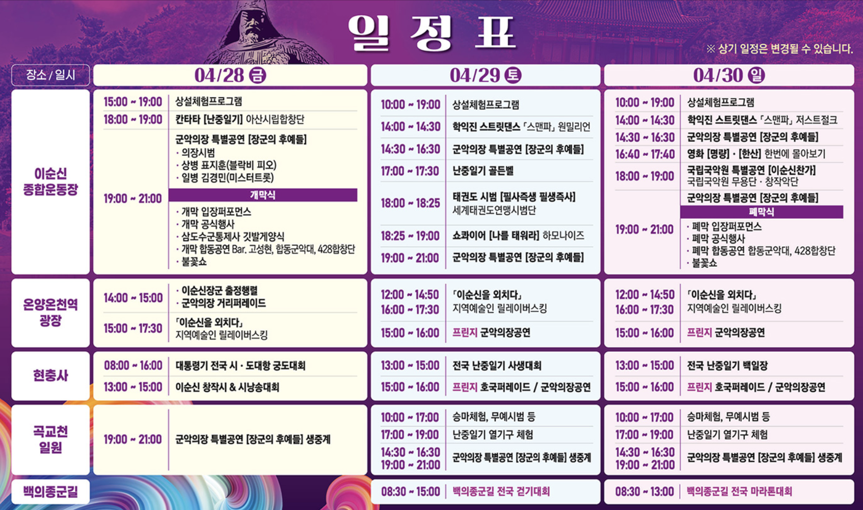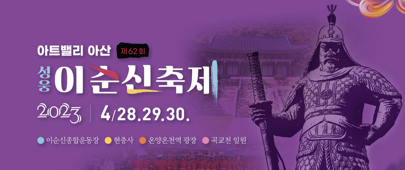 우리의 충무공 이순신 장군님의 탄신일이 언제일까? 바로 4월 28일입니다. 특히 이순신 탄신일을 맞아 충남 아산에서는 성웅 이순신 축제가 열립니다. 아산에서 제일 큰 축제로 약 60여 년의 역사를 이어가는 오래된 축제입니다. 몇 년 전 사회적으로 큰 우울한 사건 이후로 매년 축제기간쯤 일이 생겨 취소가 되거나 아주 작게 축소운영 된 경우가 많았는데요. 진짜 오랜만에 제대로 축제를 준비하고 있습니다.