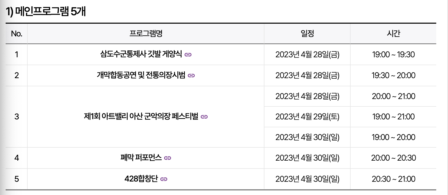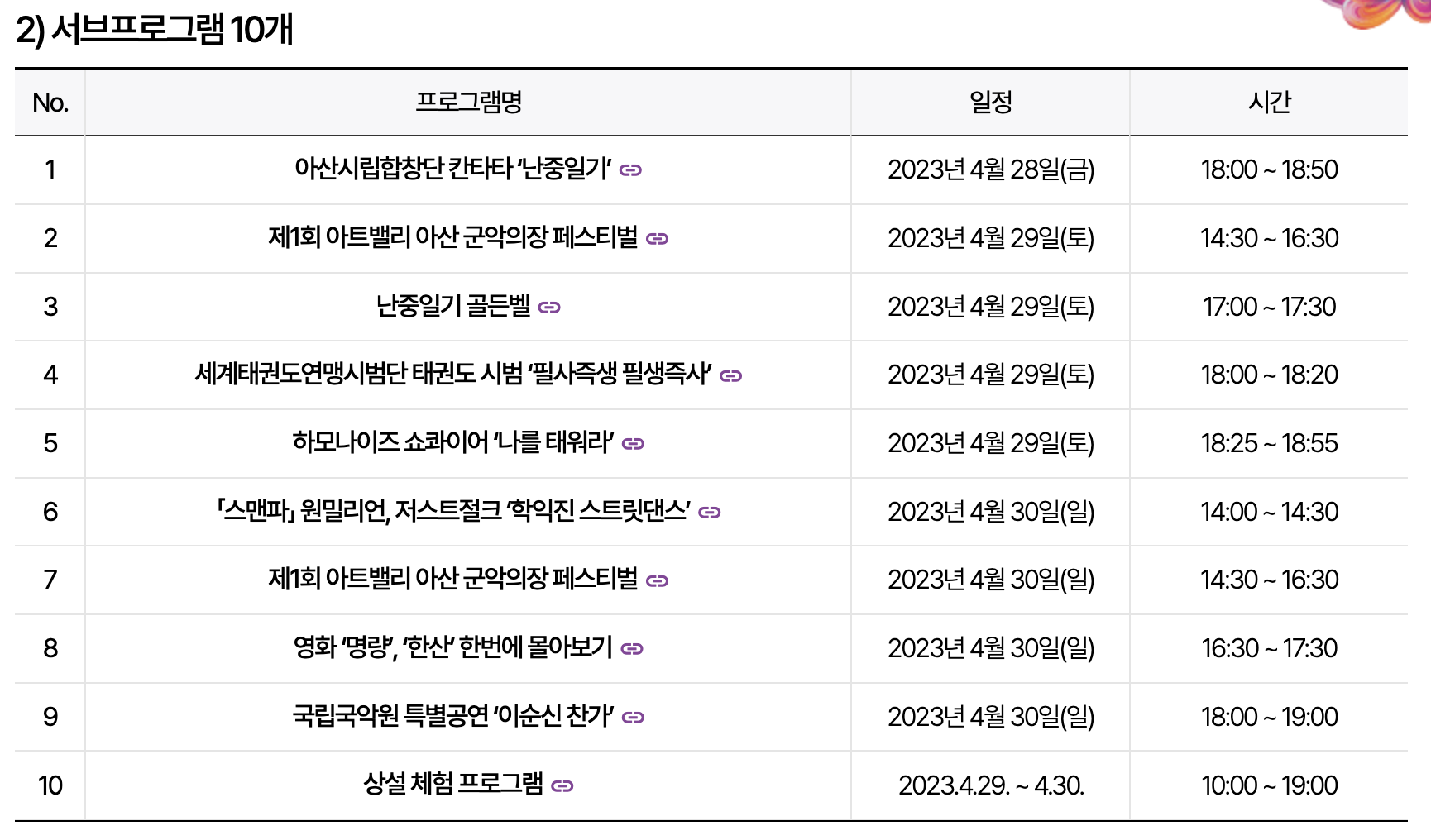 4월 마지막주 4월 28일부터 30일까지 3일간 축제가 이어지는데요. 서울에서 차로도 안 막히면 1시간 전후로 가깝고 전철로도 다녀올 수 있고, 특히 아산은 온천으로 유명하기에 재미있는 축제 보시고 아산에 곳곳에 있는 온천도 이용해 보고 가면 좋을 것 같습니다.