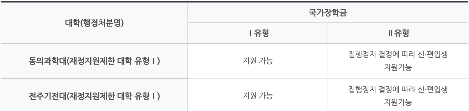 - 위 2개교는 ‘23학년도 재정지원제한대학 지정 처분(동의과학대, 전주기전대)’ 집행정지 결정(효력정지)에 따라, 학기별 장학금 최종지급일(1학기 5월 중순, 2학기 11월 중순예정, 추후 확정) 기준으로 위 처분의 효력이 정지되어 있다면 국가장학금 지원이 가능