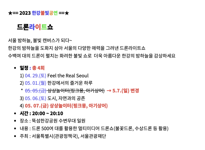 한강공원 홈페이지에서 자세한 일정은 확인하세요!!