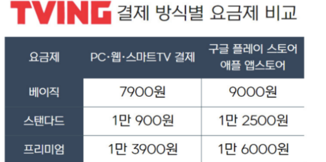 PC와 스마트 TV에서 티빙 요금제 결제하는 것과, 구글플레이, 아이폰 사용자가 사용하는 앱스토어에서 티빙 요금제를 결제하는 것이 차이가 난다.