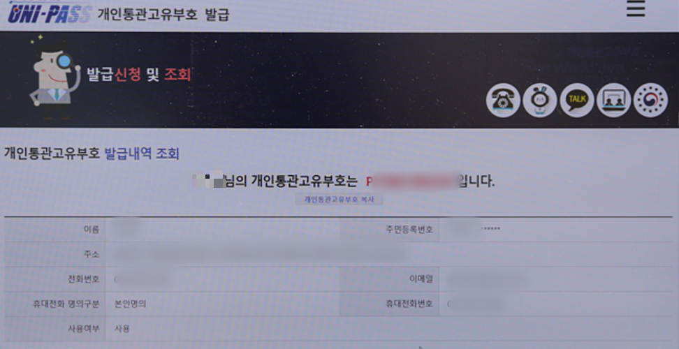 4. 인증후에 개인통관부호를 받을 수 있고 자기 이름 옆에 P로 시작하는 수자가 나옵니다. 그 전부가 발급받은 개인통관부호이니 잘 적어두셨다가 사용하시면 됩니다. 혹시나 개인통관부호를 까먹었을 때는 관세청 유니패스 사이트에서 조회를 누르면 똑같이 개인정보 인증받으시면 다시 확인 가능하니 걱정 안 하셔도 됩니다.