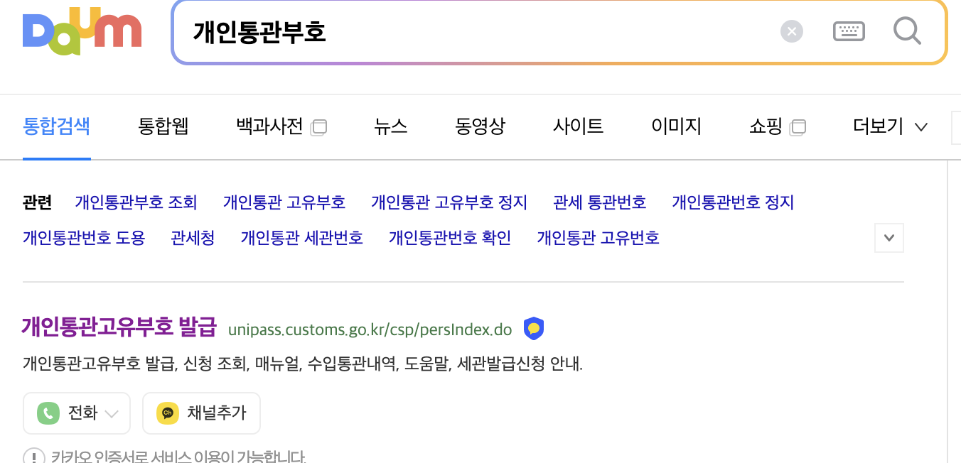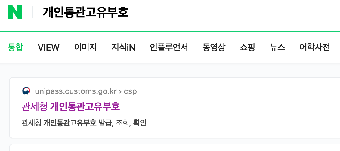 1. 검색창에 '개인통관고유부호' 또는 '개인통관부호'를 검색합니다. 그러면 제일 상단에 나오는 관세청 개인통관고유부호를 선택합니다.