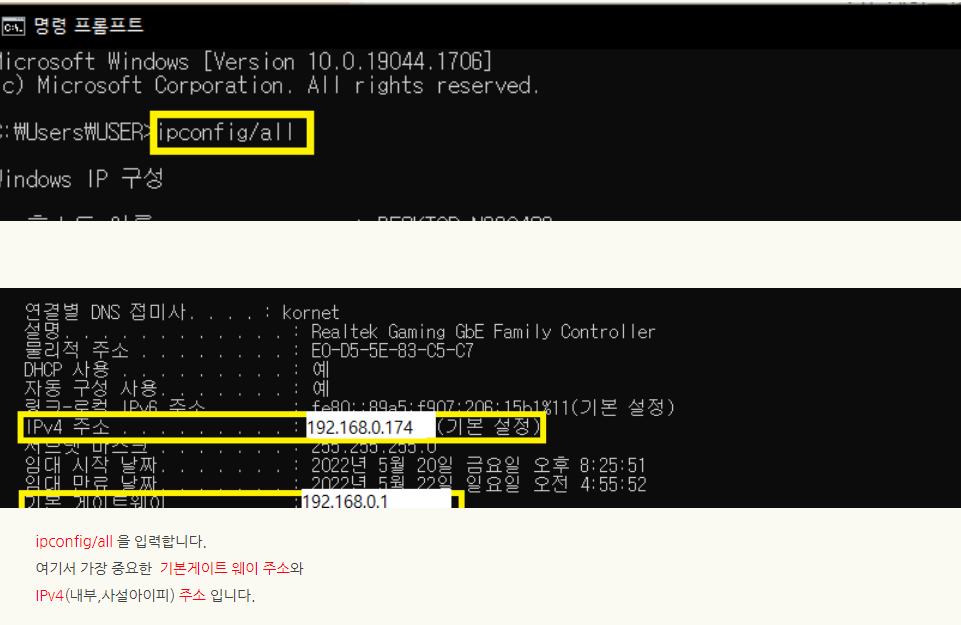 3. ipconfig/all 을 입력하여 자기 컴퓨터에 뜨는 IPv4 주소랑 기본 게이트웨이 주소를 확인합니다.
