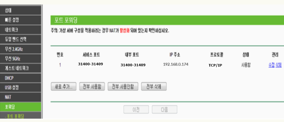 - 외부 포트범위 : 포트포워딩을 적용할 외부 포트 범위를 입력한다.